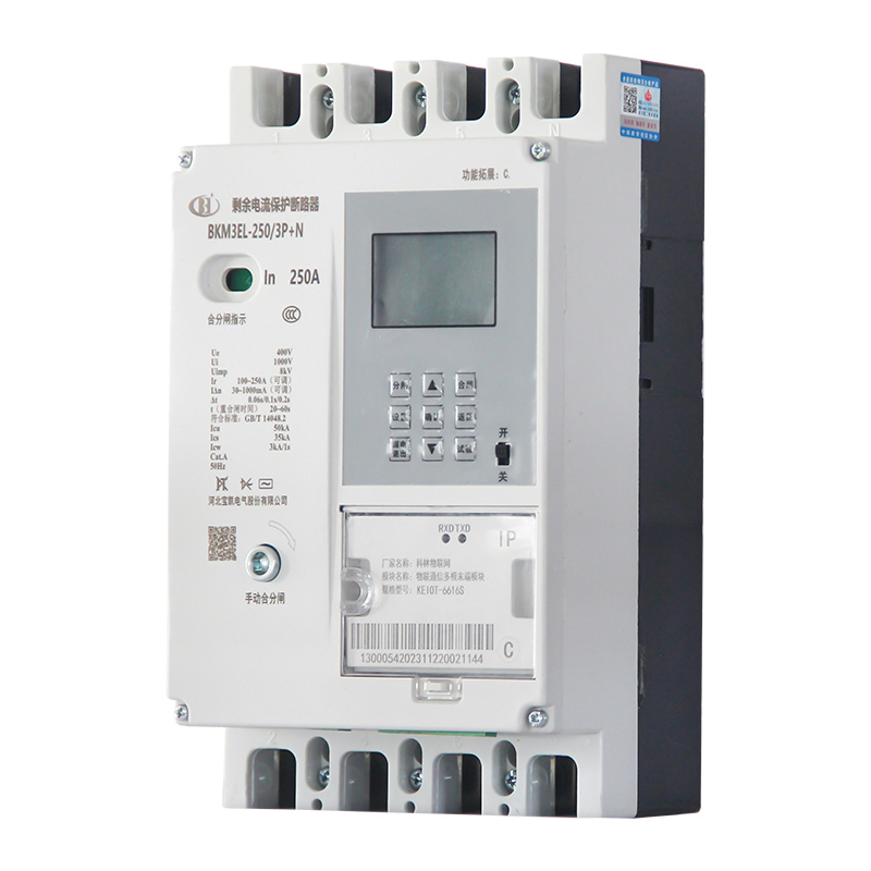 BKM3EL系列物联网型剩余电流保护断路器适用于交流50Hz,额定绝缘电压1000V,额定工作电压至400V的三相四线中性点直接接地的低压电网系统。本系列断路器具有过载保护、短路保护、剩余电流保护、过电压保护、欠电压保护、缺相保护及重合闸等功能。也可防止电气线路或电气设备接地故障引起的电气火灾和电气设备损坏事故及用来对人身触电危险提供间接接触保护。本系列断路器执行标准:IEC 60947-1及GB/T 14048.1 《低压开关设备和控制设备 第1部分:总则》IEC 60947-2及GB/T 14048.2 《低压开关设备和控制设备 第2部分:断路器》IEC 60947-4及GB/T 14048.4 《低压开关设备和控制设备 第4-1部分:接触器和电动机起动器 机电式接触器和电动机起动器(含电动机保护器)》