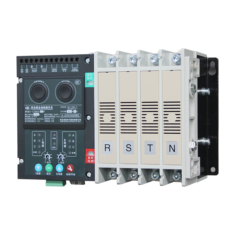BKQ3-SA/S系列三段位PC级双电源自动转换开关电器适用于交流400V及以下,额定频率50Hz,额定工作电流20A-630A的双路配电系统中。本产品主要用于国家规定的一级负荷,广泛适用于消防、邮电通讯、医院、宾馆、城市轨道交通、高层楼宇、工业流水线、等需要连续供电的重要场所。主、备电源可以是电网电源、自启动发电机组等。产品符合 GB/T 14048.11《低压开关设备和控制设备 第 6-1 部分:多功能电器 转换开关电器》。